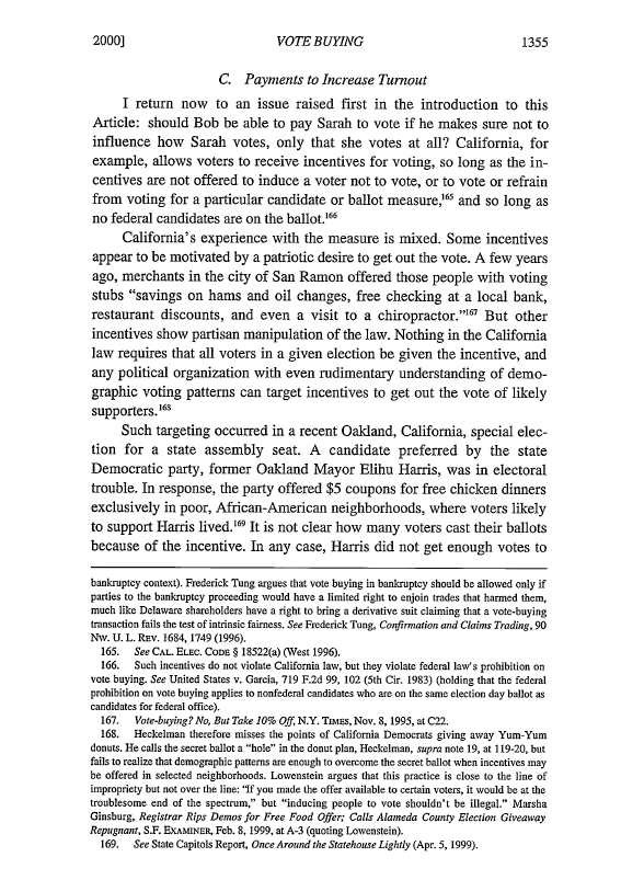 Back in my 2000 California Law Review article, Vote Buying, I wrote about how some jurisdictions, such as California permitted payments for people to register or to vote (so long as those payments were not made to induce people to vote for or against a particular candidate or ballot measure). Such payments were only allowed when there were no federal candidates on the ballot, because payments for turnout violate federal law.